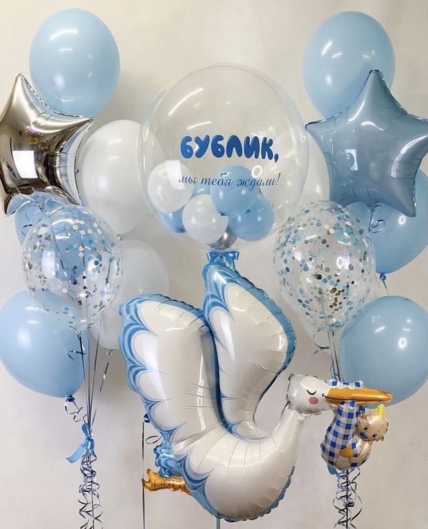Комплект на выписку "Бублик мы тебя ждали" 134 BYN В корзину В Комплект входит Прозрачный шар с надписью и шариками Фигура фольгированная аист 2 звезды фольгированные 6шт голубых 4шт белых 2 с конфетти 4 грузика В Комплект входит Прозрачный шар с надписью и шариками Фигура фольгированная аист 2 звезды фольгированные 6шт голубых 4шт белых 2 с конфетти 4 грузика