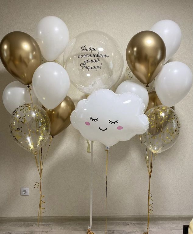Комплект на выписку " Золотое облачко" 124 BYN В корзину В Комплект входит Прозрачный шар с надписью и перышками Фигура облако 4шт хром золото 6шт белых 4шт с конфетти 4 грузика В Комплект входит Прозрачный шар с надписью и перышками Фигура облако 4шт хром золото 6шт белых 4шт с конфетти 4 грузика